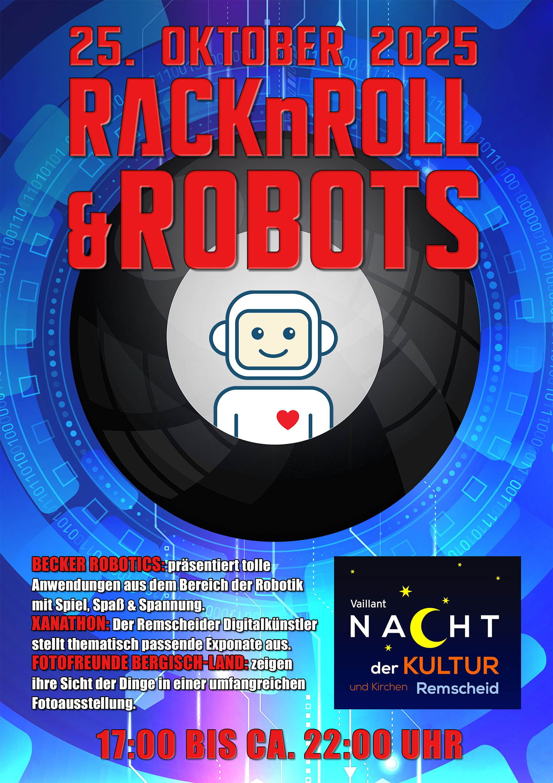 Für eine Veranstaltung im Rahmen der „Nacht der Kultur“ 2025 in Remscheid sollte ein Eventposter erstellt werden. Thema war „Roboter“. Da das Event in einem Billardcafé stattfindet, wurde ein Roboter in einem 8-Ball integriert und ansonsten ein Hightech-Ansatz gewählt.